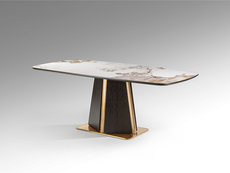 Mesa de comedor realizada en DM contrachapado en roble oscuro, acero inoxidable acabado oro rosa. Tapa de porcelánico de 5 mm, acabado mármol veteado, con cantos redondeados.